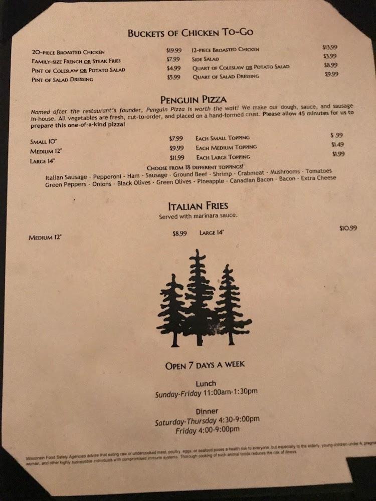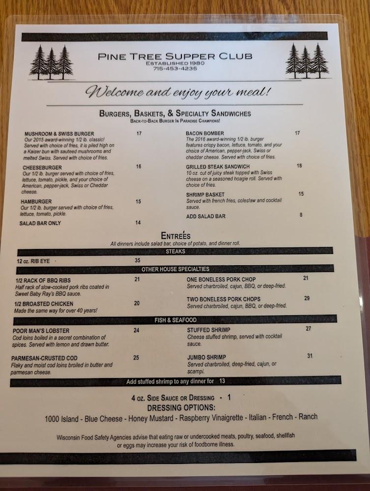 Welcome to Pine Tree Supper Club, nestled in the heart of Tomahawk, Wisconsin. Enjoy a delightful dining experience where American grill favorites meet local specialties. Our warm and welcoming atmosphere is perfect for solo diners or groups alike. Indulge in excellent cocktails and an extensive selection of beers and wines. We offer dine-in, takeout, and delivery services, with a menu that ranges from brunch to dinner and delectable desserts. Enjoy our happy hour specials and relax knowing our venue is wheelchair accessible. Join us for a satisfying meal that embodies the charm of the Northwoods!